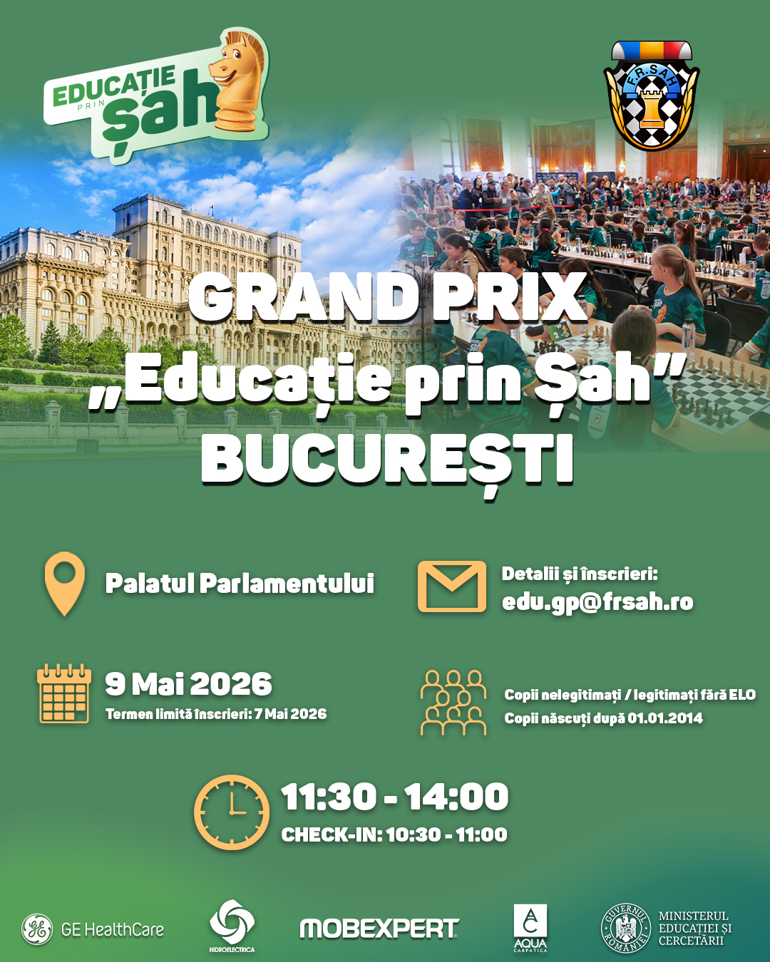 Programul „Educație prin Șah” continuă și în 2026 în cadrul Romania Grand Prix! Astfel, paralel cu etapele Grand Prix, cei mai mici iubitori ai șahului vor avea parte de competiții dedicate, într-un cadru special.