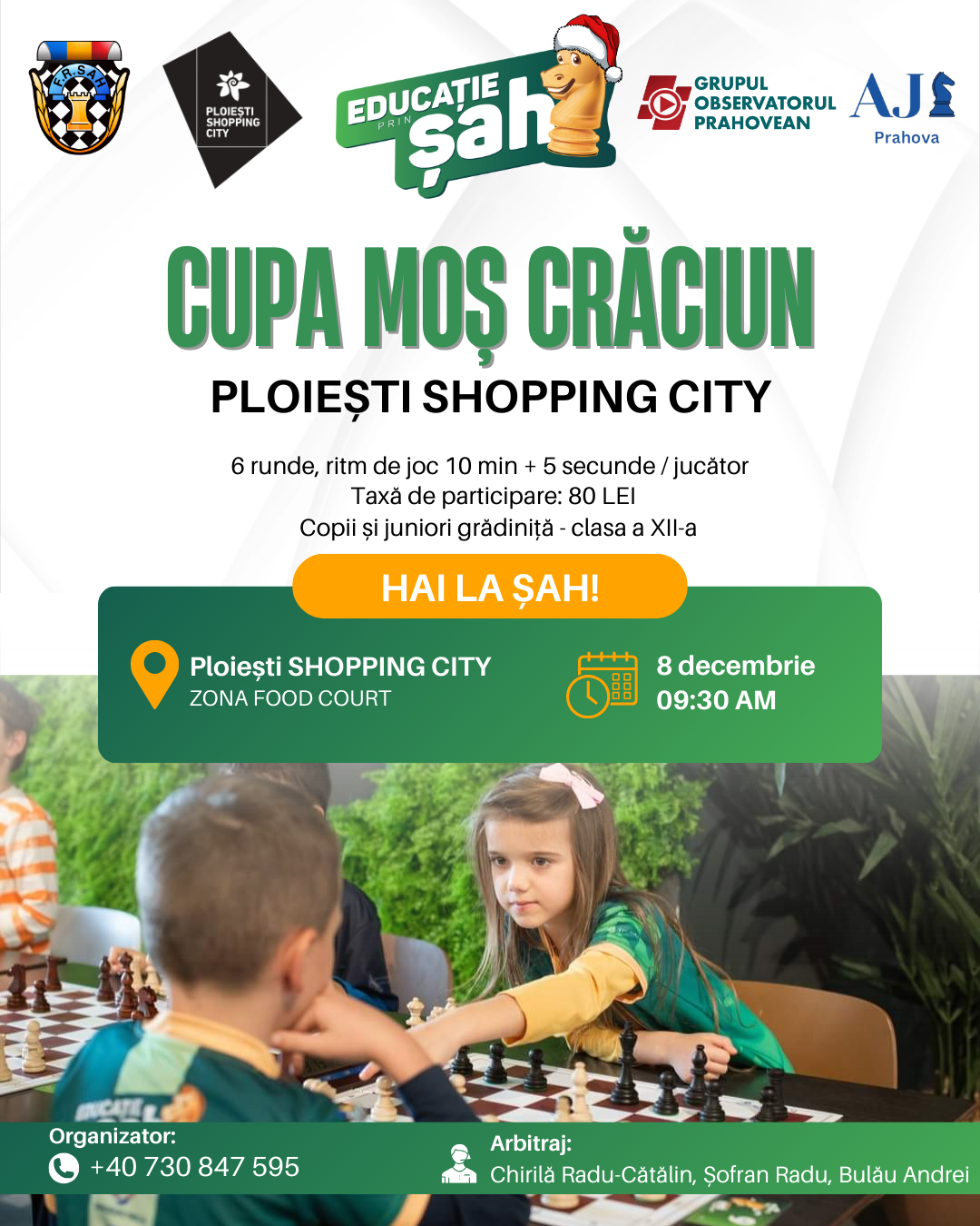 Dumincă, 8 decembrie, ne vedem la Ploiești Shopping City, unde Moș Crăciun așteaptă micii șahiști cu premii și surprize!