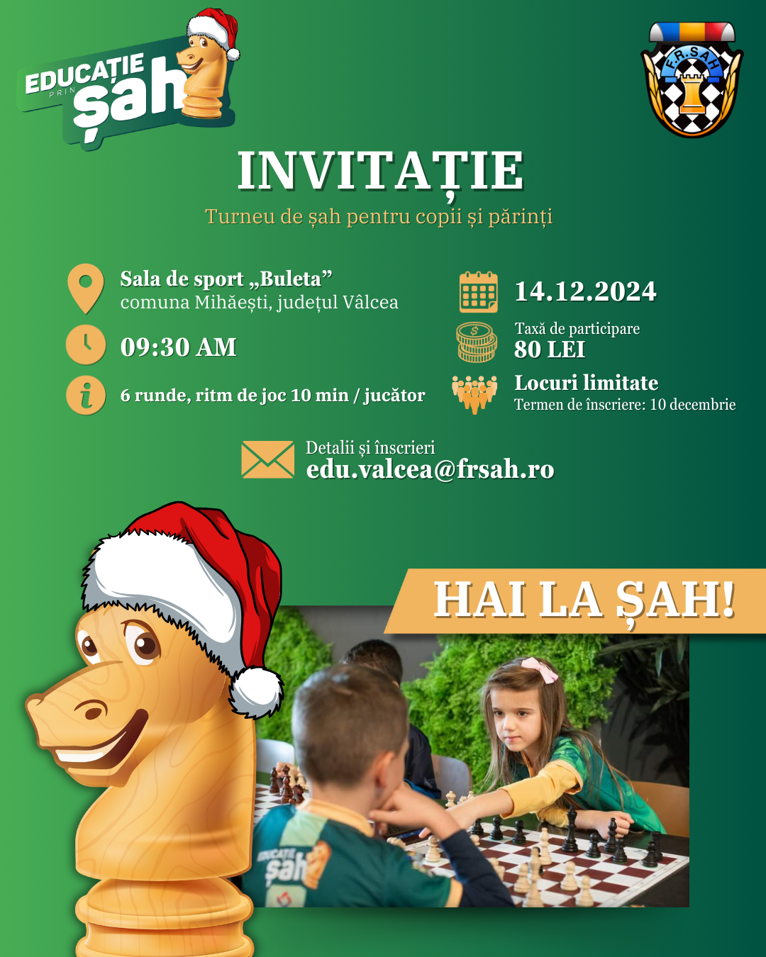 Copiii și părinții sunt așteptați la un turneu de șah unde Moș Crăciun dă startul competiției! O zi plină de șah, premii și surprize pentru toți participanții, mici și mari.