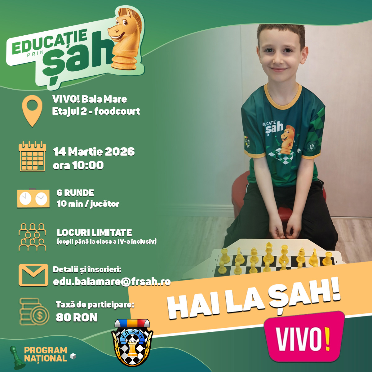 Pe 14 martie 2026, Programul Național Educație prin Șah ajunge la VIVO! Baia Mare, unde micii pasionați ai jocului minții sunt invitați să participe la concursul „Hai la Șah!”, organizat în zona Food Court, la etajul 2 al centrului comercial.