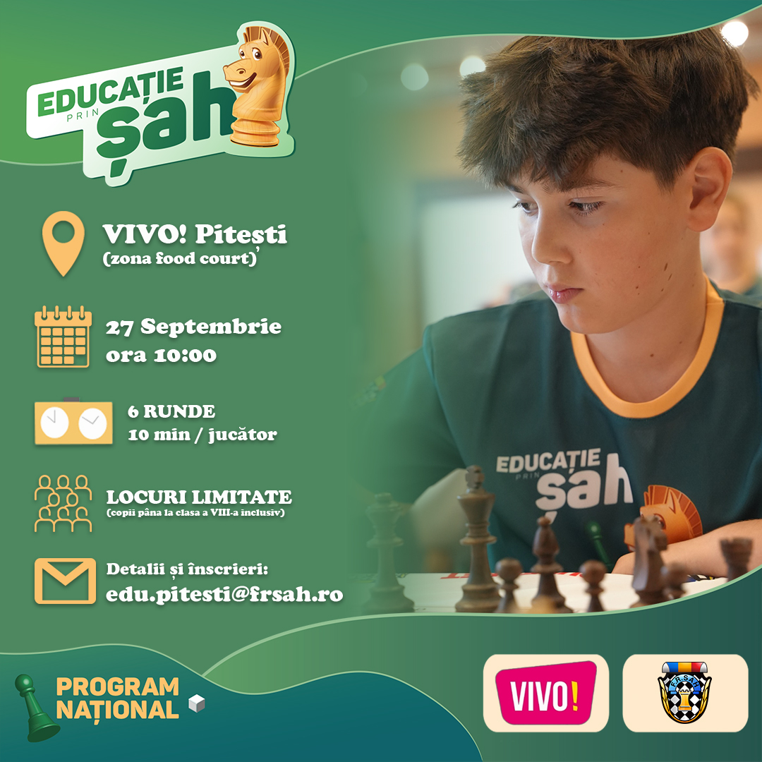 Pe 27 septembrie, începând cu ora 10:00, centrul comercial VIVO! Pitești (zona food court) va găzdui o nouă etapă a programului Educație prin Șah.
