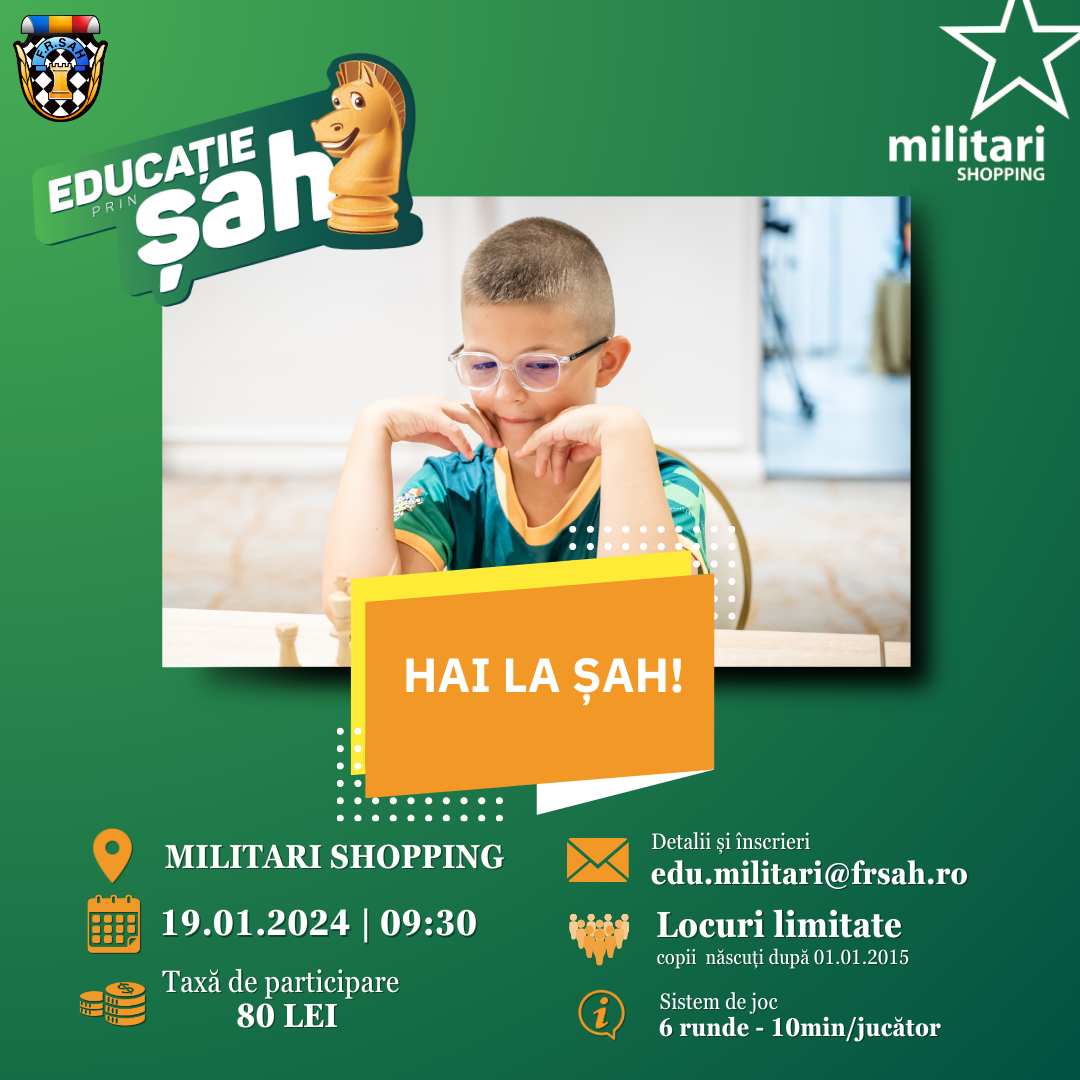 Ne vedem pe data de 19 ianuarie, la @militarishopping, pentru primul turneu Educație prin Șah din anul 2025, unde garantăm premii și voie bună!