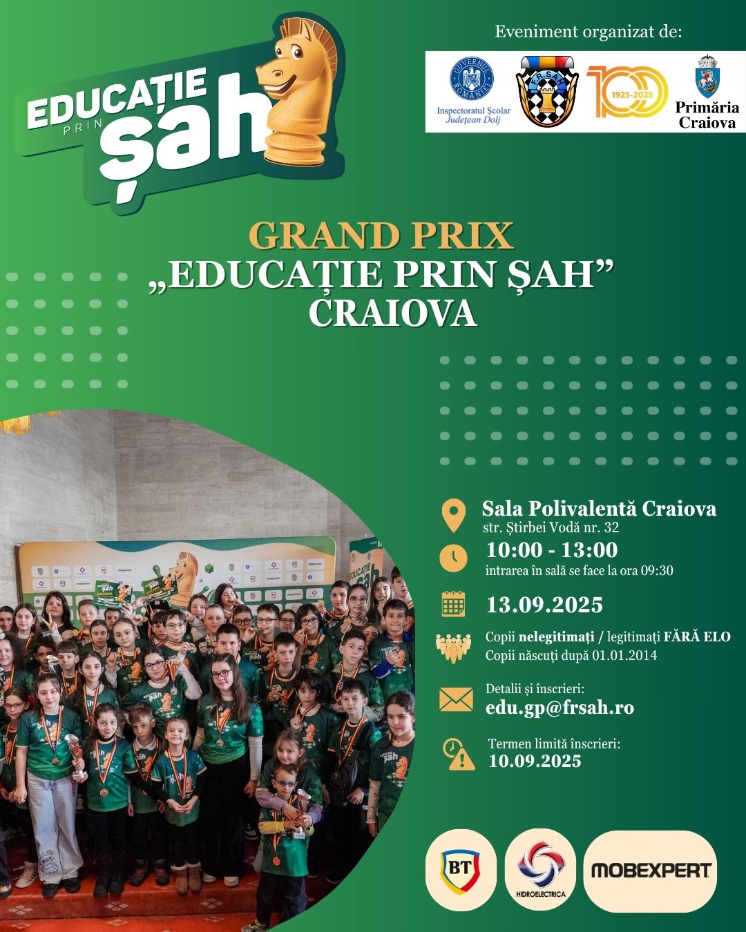 Ultima etapă din 2025 a Circuitului Grand Prix – Educație prin Șah va avea loc în data de 13 septembrie, la Craiova! Sute de copii sunt așteptați la Sala Polivalentă pentru a ne bucura de șah împreună.
