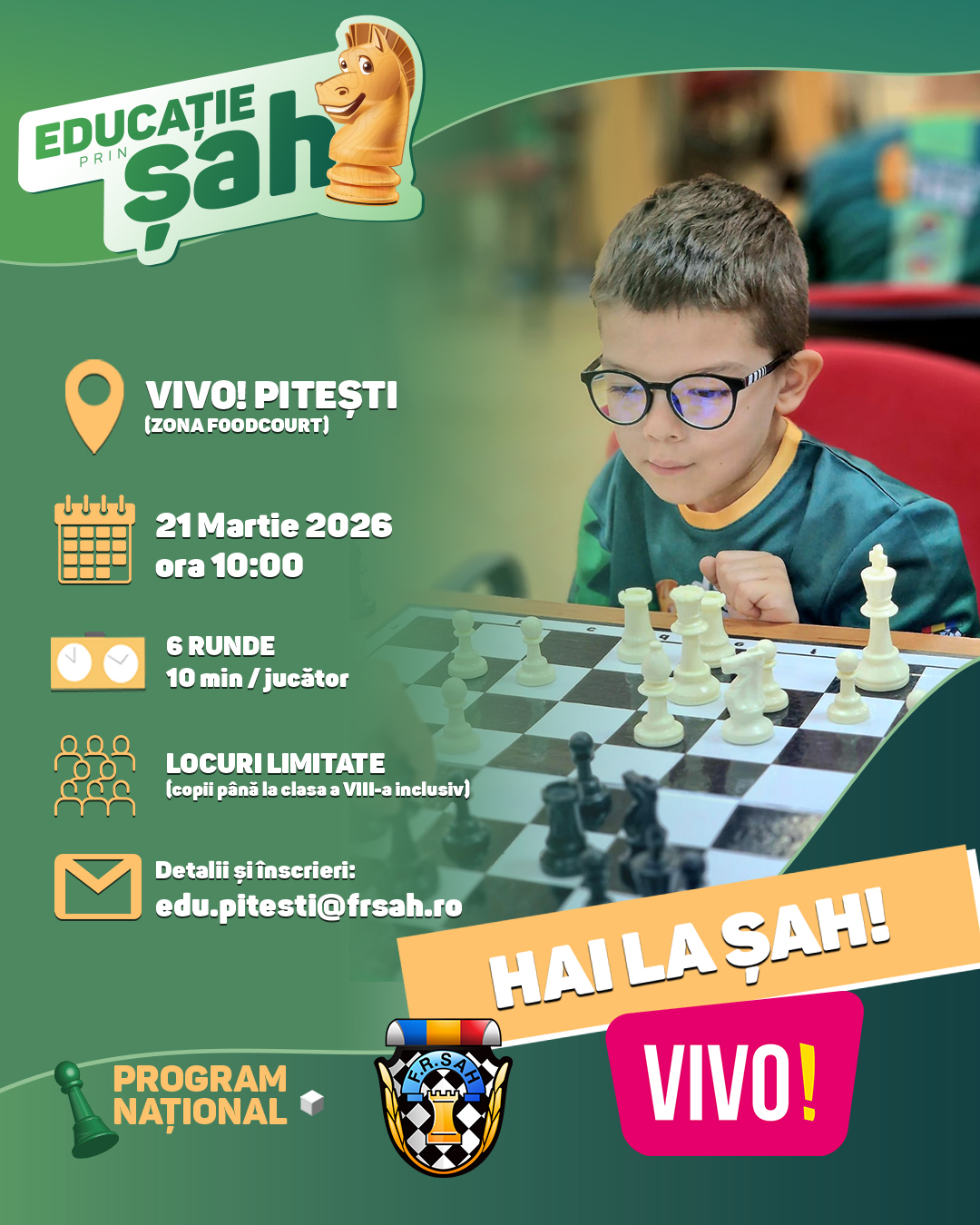 Programul Național „Educație prin Șah” continuă seria evenimentelor dedicate copiilor pasionați de șah prin organizarea unui nou concurs în cadrul centrului comercial VIVO! Pitești.