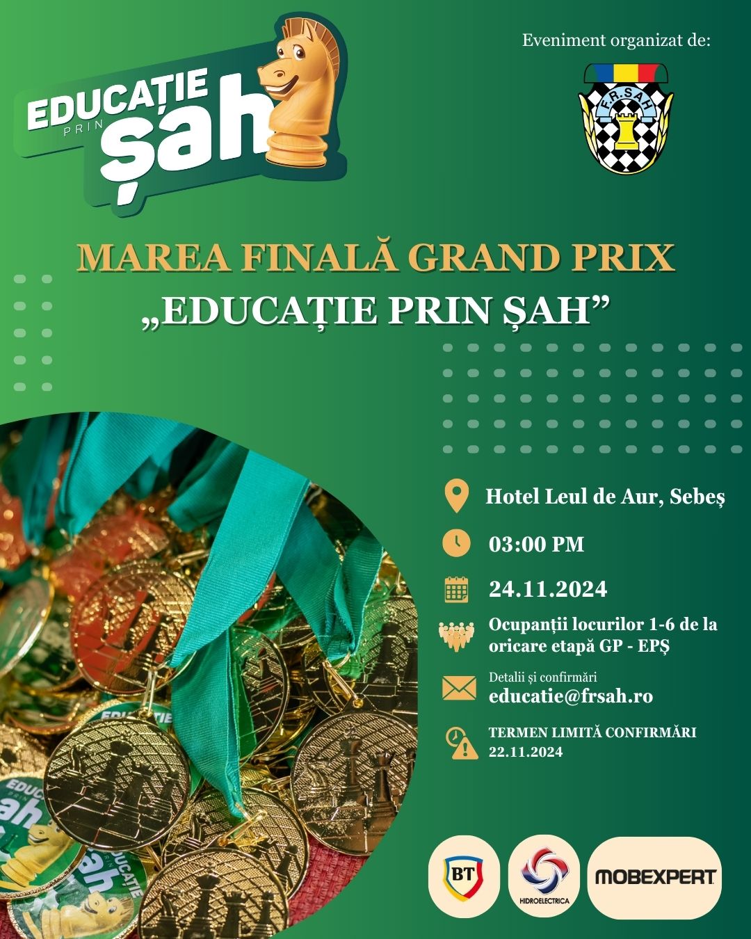 Marea Finală va avea loc la Sebeș, județul Alba, în data de 24 noiembrie, ora 15:00 și va aduce împreună cei mai promițători tineri șahiști pentru o zi plină de competiție, premii și experiențe memorabile.